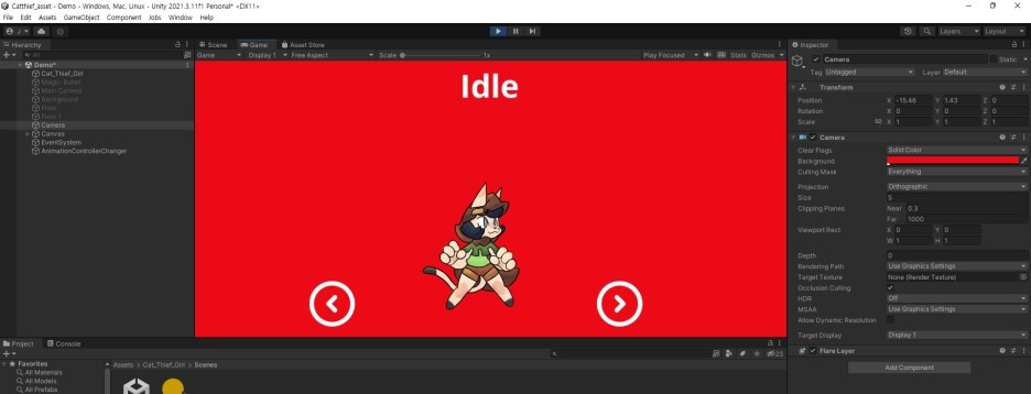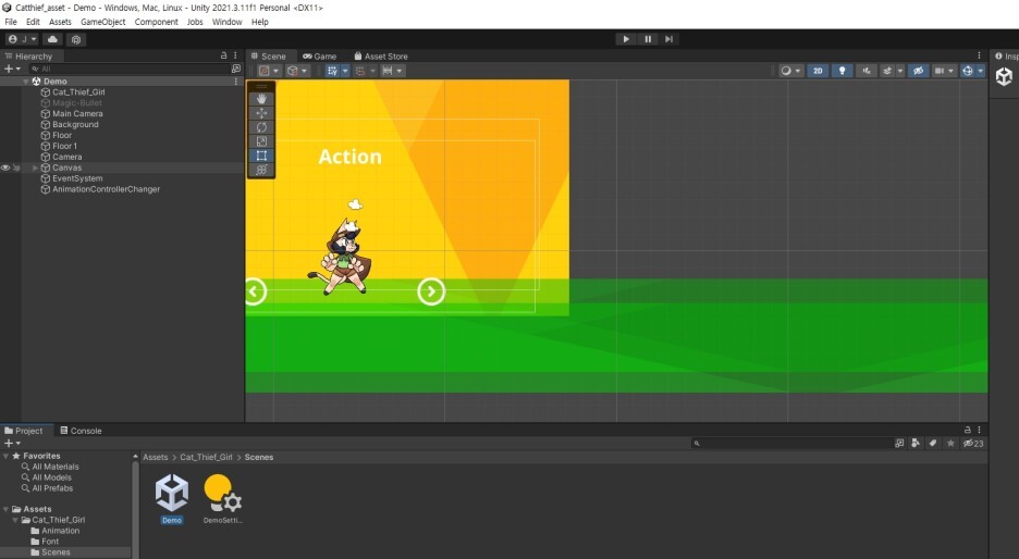 import 된 asset 의 Demo 파일을선택 하여 실행 하면 해당 캐릭터의 액션을 볼 수 있다