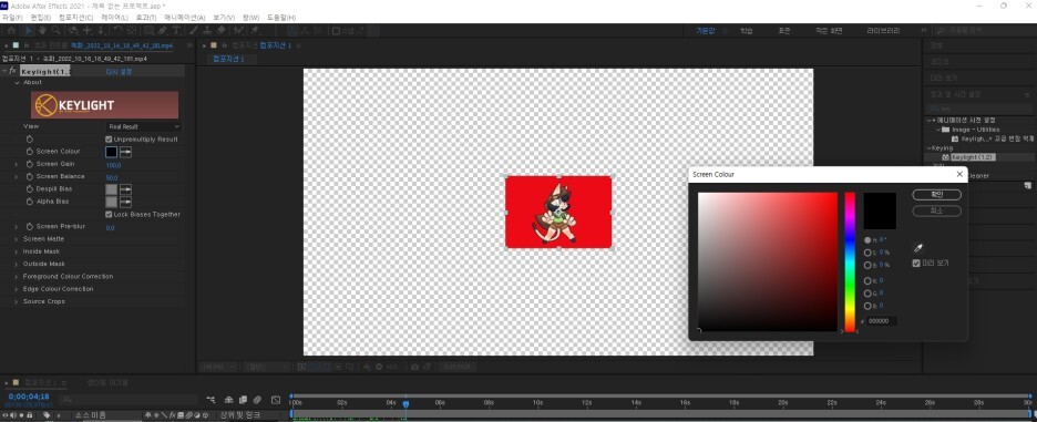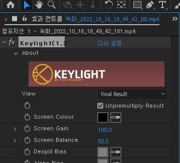 Keylight 에서 스크린컬러의 배경색 선택 후 스포이드 선택하여 빨간 배경 에 대면 빨강이 빠진다. 하지만...
