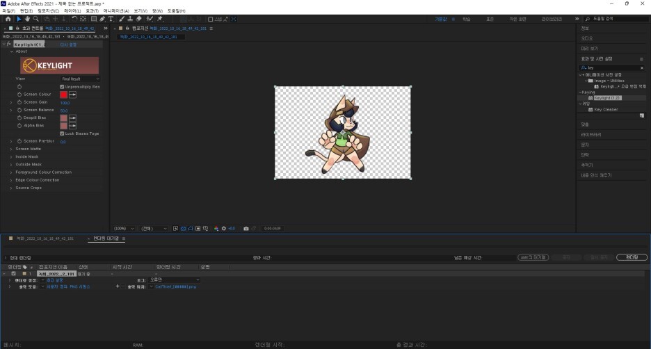 초록색 배경으로 해주는게 좋긴한데 저 고양이 캐릭터 옷이 녹색이다 보니 나중에 색을 뺄때 어려워서 빨강을 했다....그런데 빨강을해도 빨강색이 들어가 살색에서 빨강이 빠져서 좀비 처럼 차가운 피부색이 되므로 추가 작업은 필요했다.