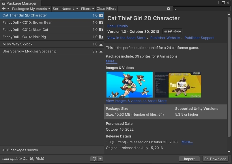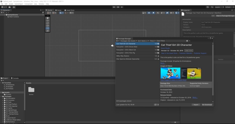 위와 같이2D Template 로 새로 만들기 한 후 메뉴 에서 Asset Store 로 접속 하는 방법도 있고 Asset Store 에서 이미 구입을 했다면 Package Manager 를 실행 시키면 구입한 Asset이 뜬다.
