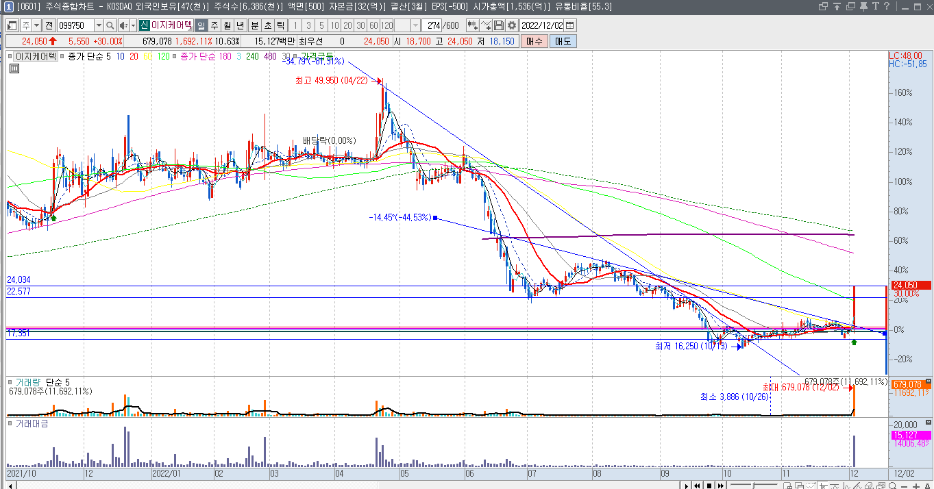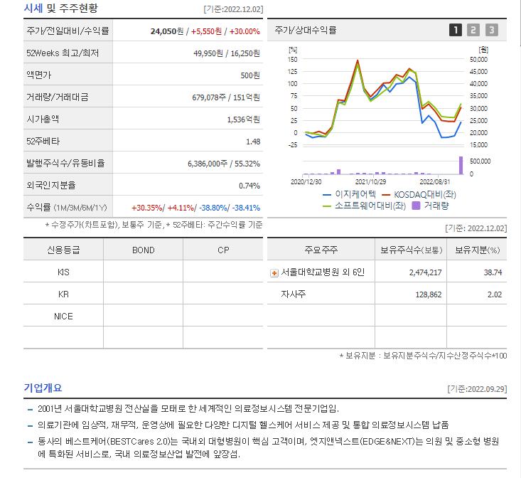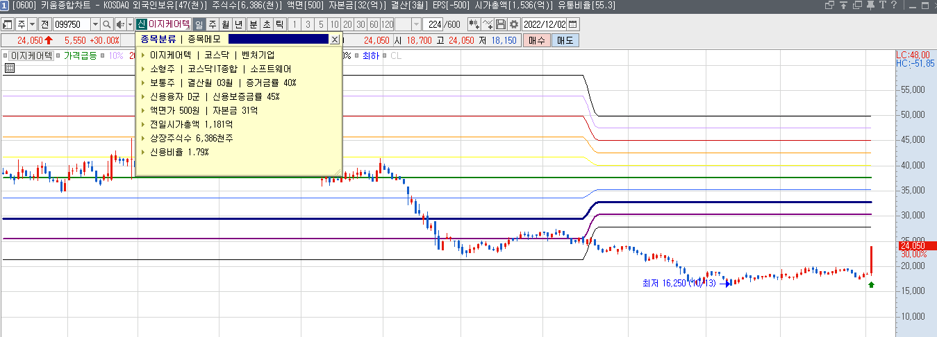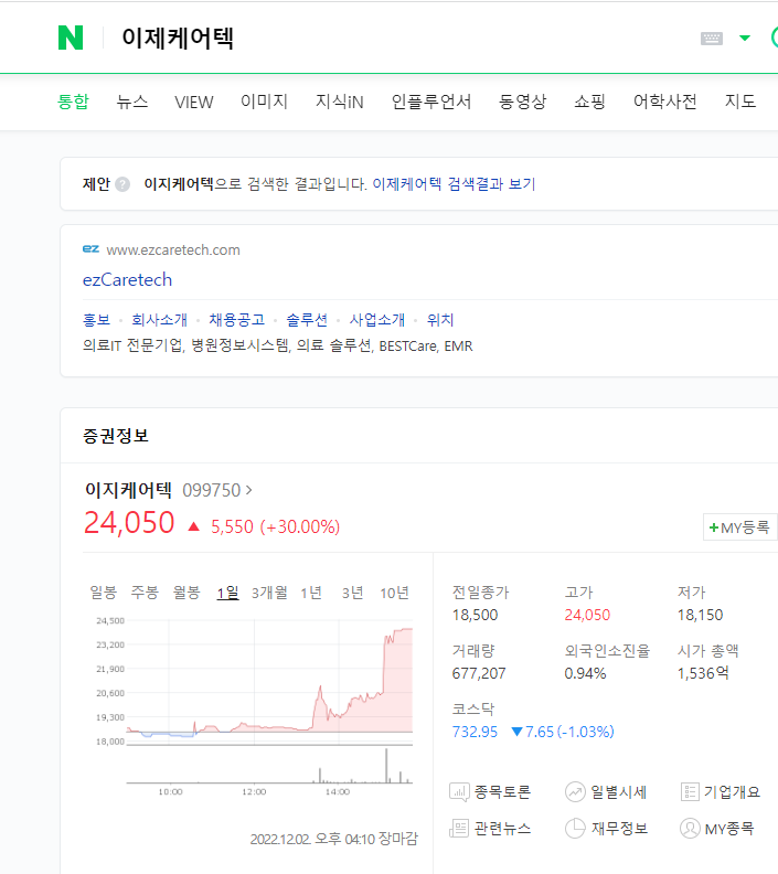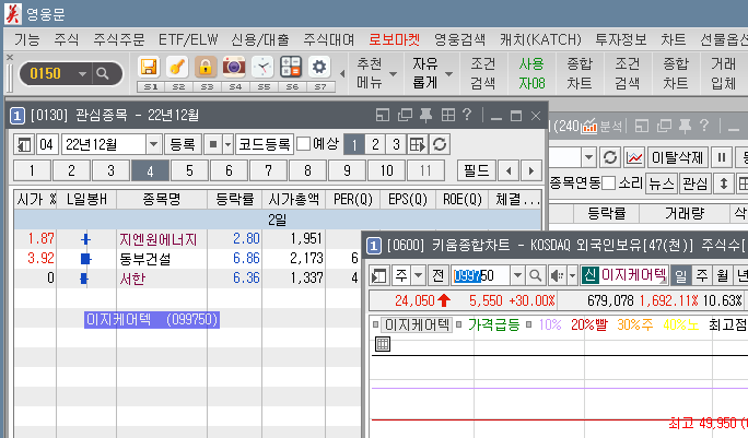 그러면 한번 위에서 선택한 전일상한가 2022년12월2일 상한가 종목중 이지케어텍 099750 이종목을 관심종목에 담아놓고 한번 보자.