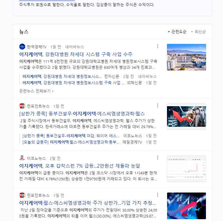 이지케어텍인데 오타를 내서 "이제케어텍"이라고 했는데 개딱같이 말한걸 철떡같이 알아듣고 검색해준다 고마운 네이버