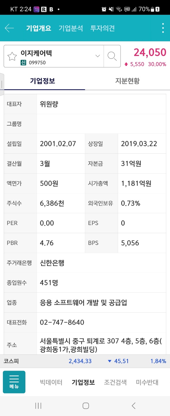 지분은 지분소유 비율 46% 머 나쁘지는 않다. 그냥 나중 지분소유 비율이라 표현하는데 간단히 말해서 시장에서 매매할 수 없는 주식 즉, 오너패밀리나, 관계사, 또는 투자사, 지주사, 우리사주등에 포함한 지분이다. 즉 이종목은