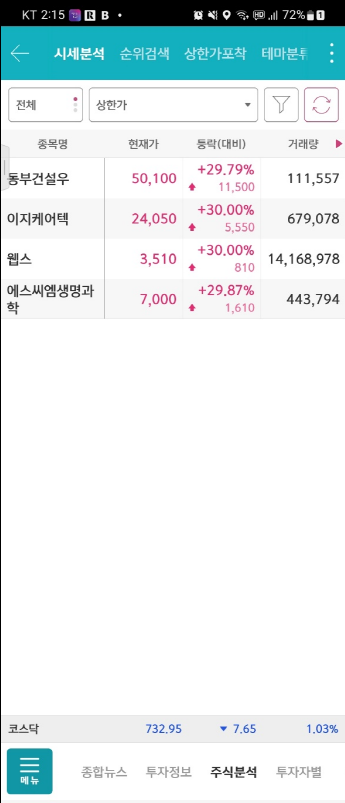 MTS를 기준으로 설명하면 메뉴에서 [주식분석] 으로 간다 거기서 [상한가] 종목을 찾으면 저렇게 나온다. 요즘 장의 특성상 안나오기도하고 대체로 적게 나온다..장안좋을때는 이런게 참좋다...ㅎㅎㅎ
