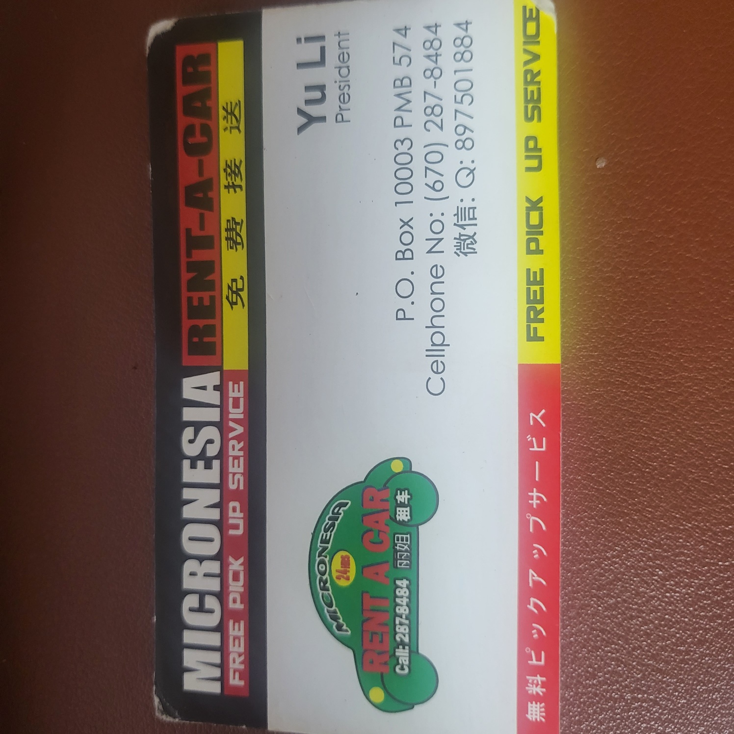 일단 한국인 렌터카 보다 싸다. 하루기준 꽤나 차이난다. 그리고 차량 반납을 호텔에서 차량을 받아주는데, 사장님이 직접 밑에 직원과 같이 와서 나한테 "친구들 소개 많이 해줘 담에 올땐 더 잘해줄께 하면서 명함을 어려장 줬다." 되게 친절하다.!가 아니구...사실 이유가있다. 이 망할 회사가...중국인들이 하는 회사인것으로 보인다...영어 인토네이션을 광동어 처럼 한다....;;; 그리고 나한테 사기칠려그랬다. 첨에 이상한 차 창문도 안움직이는 거지같은걸 타게 할려그러다 걸렸다. 머 중국이 그렇지머...암튼 그것에 대해서 강약강약으로 클레임을 걸고 친히 가게까지 가줬더니 좋은차로 바꿔주고 시트청소도 해주고 했다. 되게 엄마같은 특유의 중국아줌마 말투로 사장이 잘해줬다. 갠적으로 본인이 꼼꼼한 성격이면 Micronesia 추천한다. 저렴하게 사진찍기 좋은차를 렌트할수 있다. "4월에 왔던 한국인 J 에메랄드 머스탱 차바꿨던 친구" 의 친구라고 하면 Boss Ma'am 잘해줄지도....나는 사장님을 저렇게 불러드렸는데 싫지 않아 하는것 같았다.