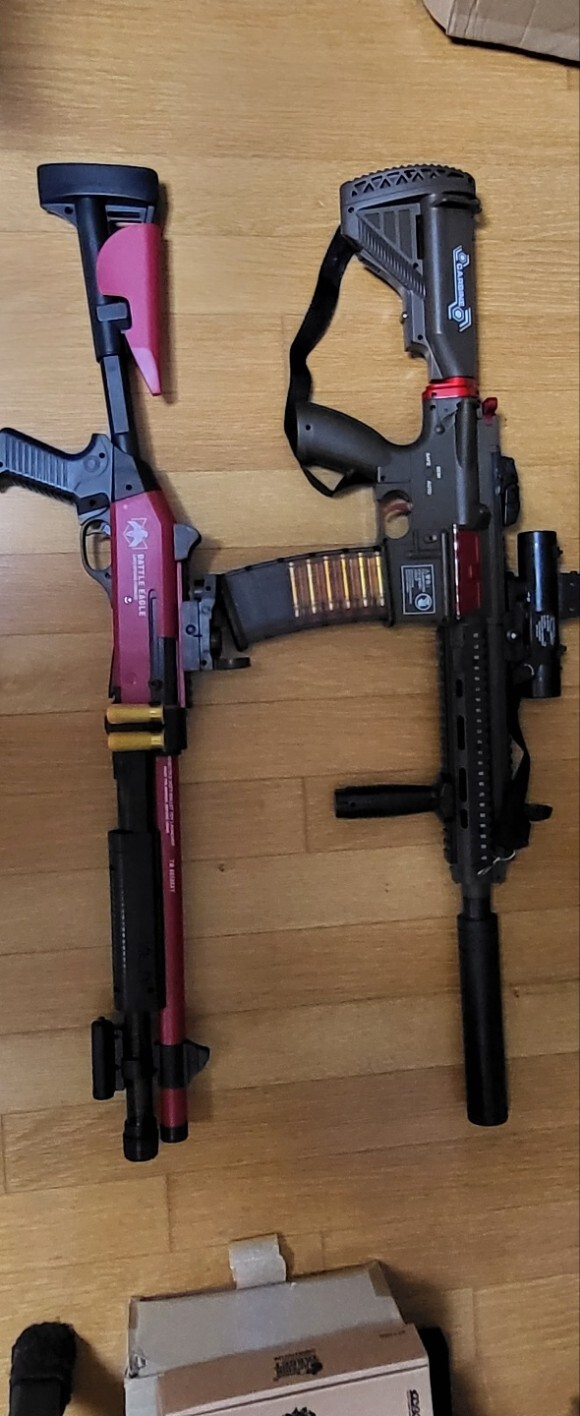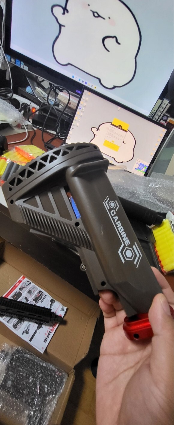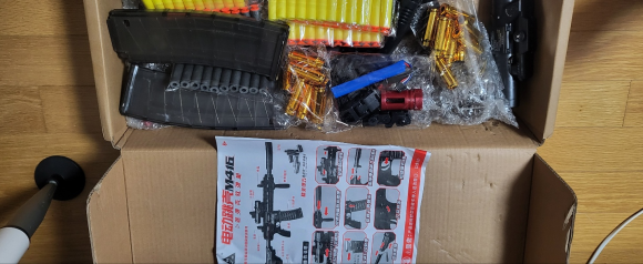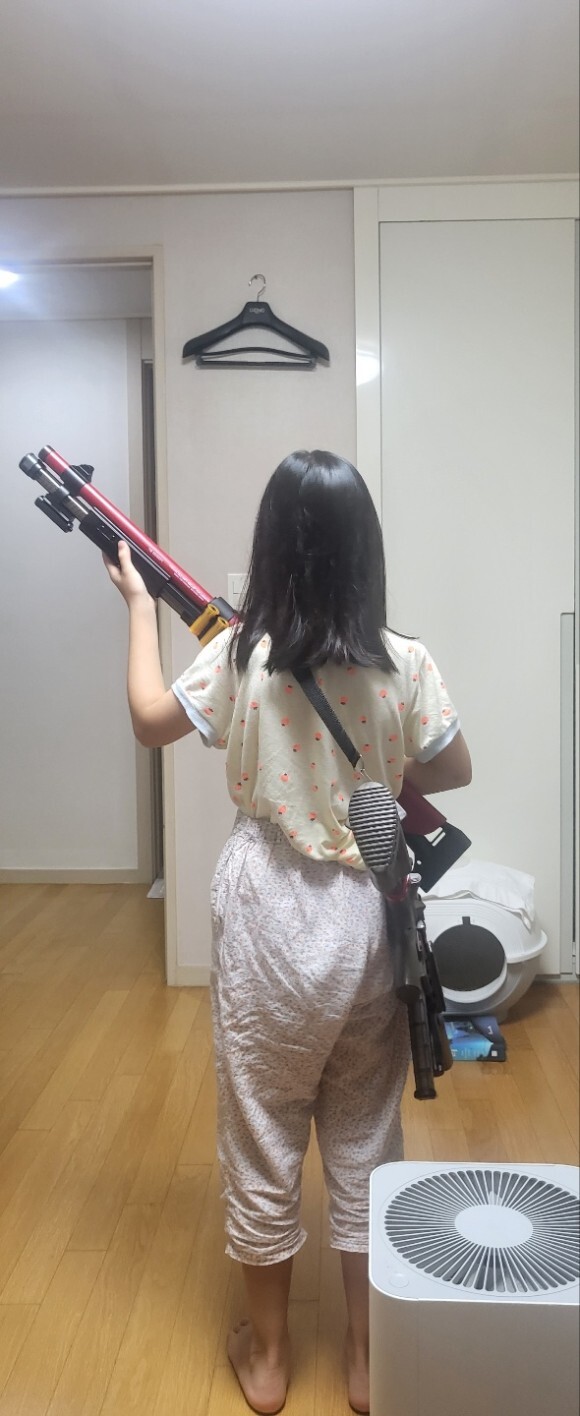 지난번 베넬리 탄피배출 샷건은....재밌긴한데 딸아이가 가지고 놀기에 펌프액션이 익숙치 않고 힘이약한 여자아이에게는 다소 무리가 있을 수있다. 그런데 이 자동소총은 따로 장전이 필요없고 (장전손잡이가 폼으로 스프링만 왔다갔다) 가볍게 쏠수 있다. 그리고 이번에 소총도 역시 너프건에 비해 파괴력은 궁둥이샷을 해봤는데...두꺼운 옷입었을때는 맞은줄 모를정도...매우 안전하다
