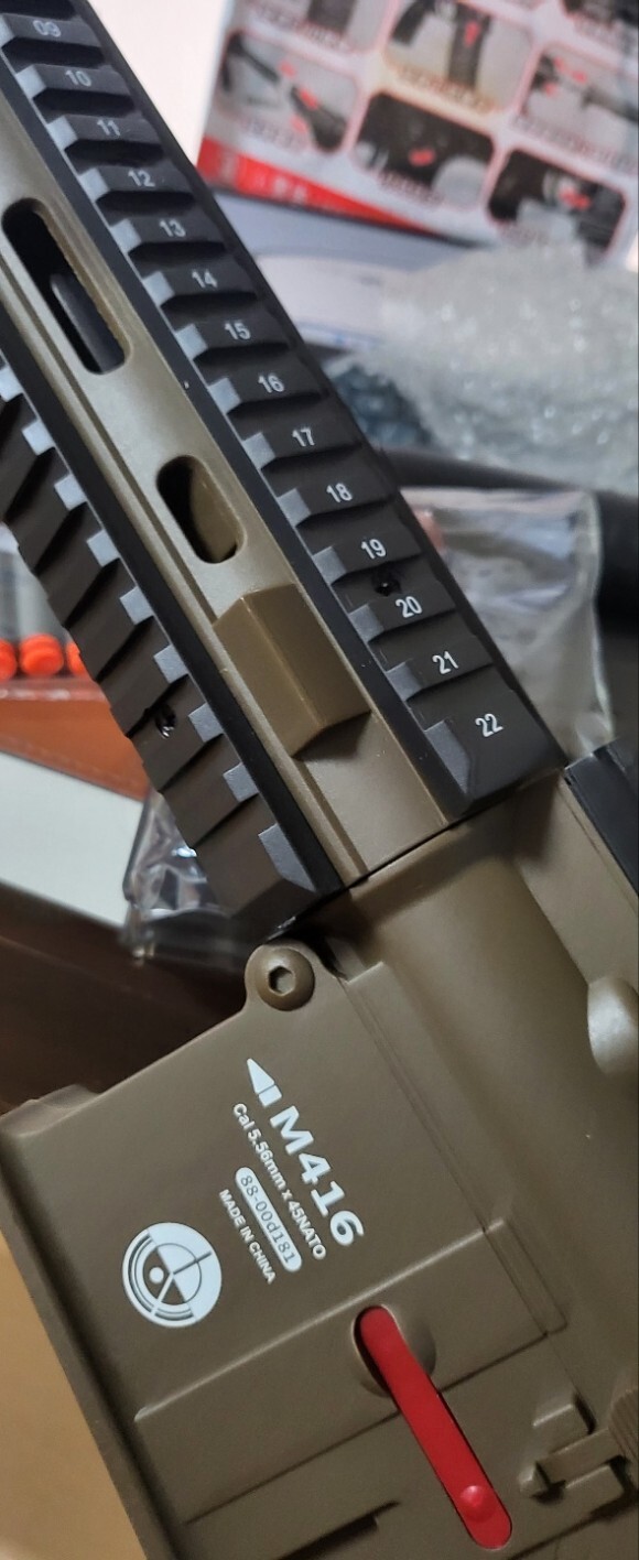 악세사리를 설치할 수 있는 레일이 4방향으로 달려있다. 규격이 대략 에어소프트건 악세사리를 꼽아될 정도로 비슷해보인다