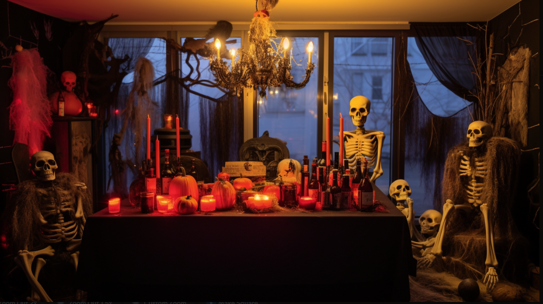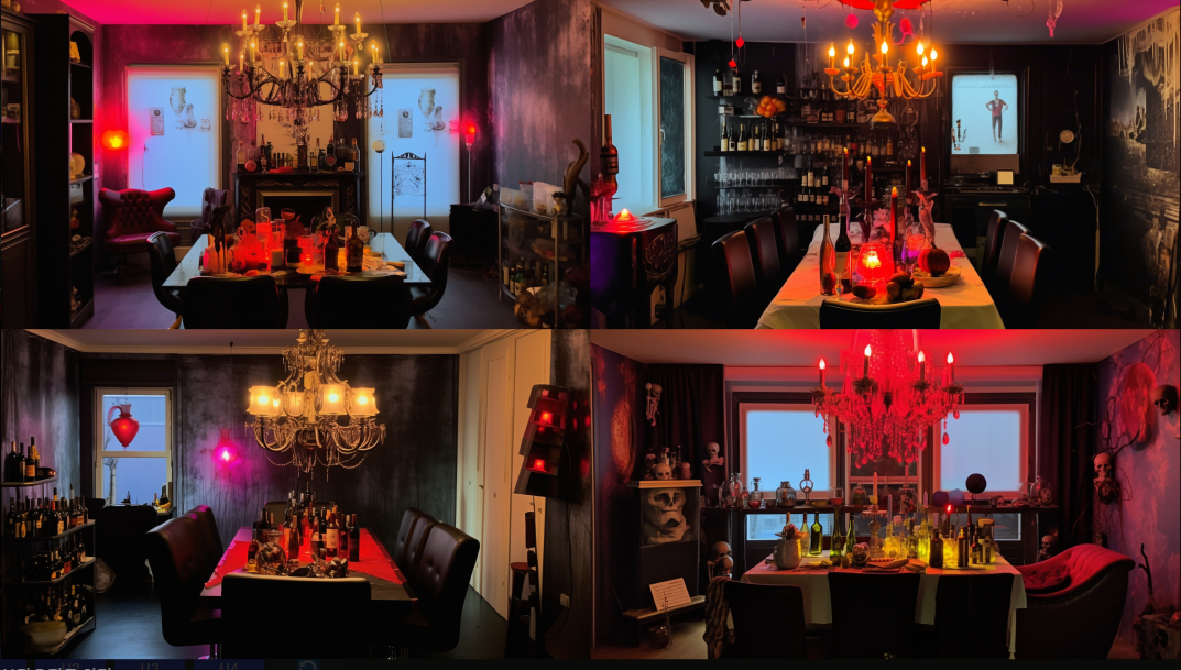 /imagine prompt:[이미지주소] Transform this party room photos into a full-on Halloween party, Dark, grotesque lighting and bloody wallpaper,    --style raw --ar 16:9 --v 5.2