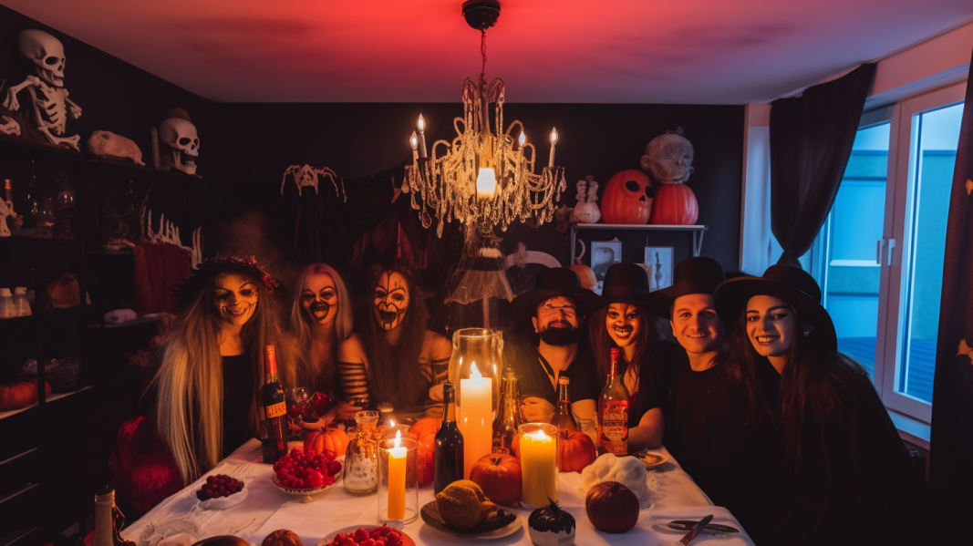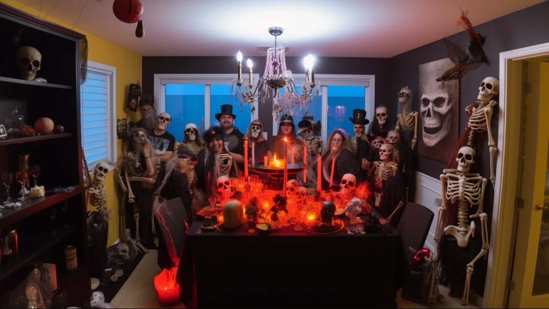 /imagine prompt: [주소 이미지] About 8 men and women in their 30s are having a Halloween party here --style raw --ar 16:9 --v 5.2