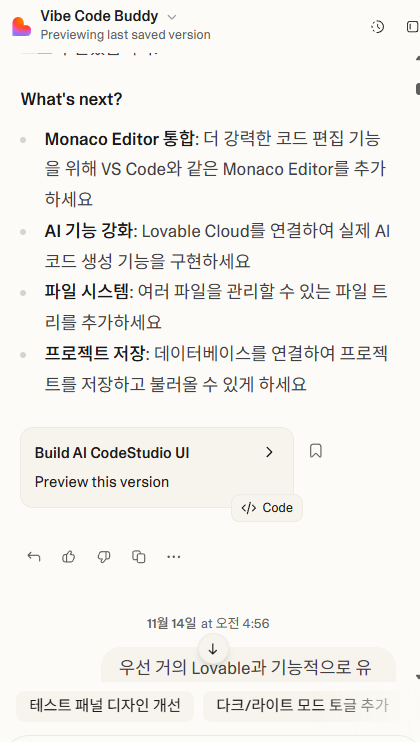 Lovable 로 만들고 있는 바이브코딩툴에 Lovable에는 없고 Replit 에 있는 강력한 기능을 만들기 위해서 저렇게 프롬프트를 넣었어요..아직은 구현에서는 에러가 나고 있습니다.
