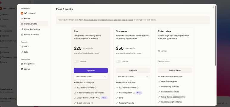 Lovable은 가입자들에게 무료로 5 Credit을 매일 배급해줍니다. 물론 사용 안하면 사라지고 담날은 다시 5 Credit을 제공합니다.