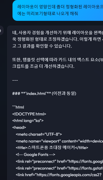 채팅창에 소스코드를 와창장 넣어버리는 문제..이걸 저말에 의해 해결했다가...지금 다시 또 저문제가 생기고 있음 바이브코딩툴의 고질병중 하나인 기능 개발 하다가 앞에서 해결된 문제 다시만들고 모른척하기...