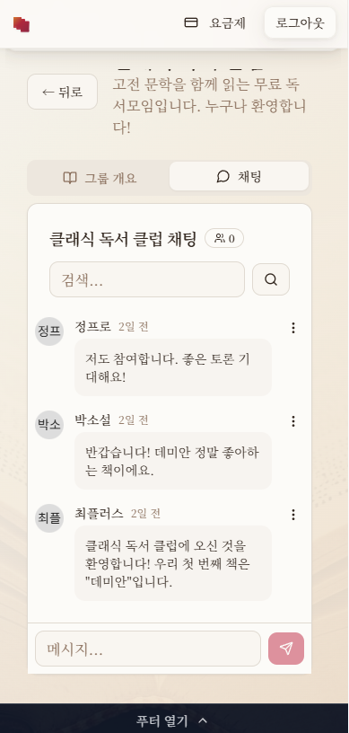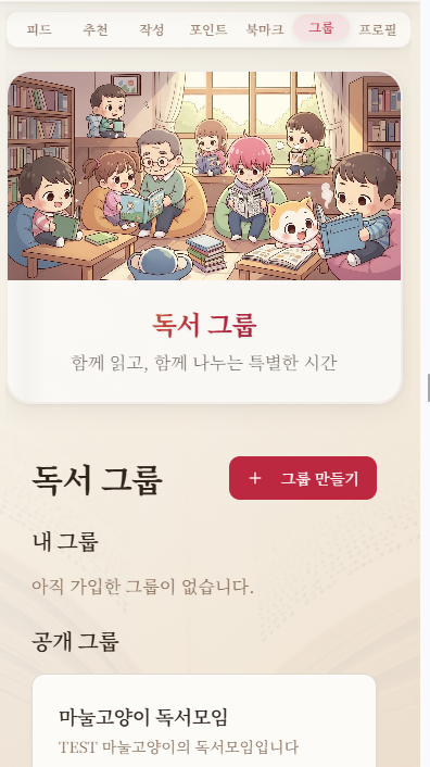 그리고 소개해드릴 내용은 독서그룹 즉 독서모임기능입니다. 독서모임은 권한이 있는 사람(지금 유료화를 좀 기획중입니다. 당분간은 무료로 할생각이긴한데 유료플랜 개발진행 테스트중입니다)