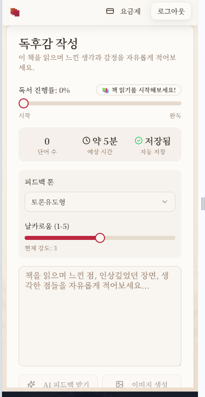 그리고 독후감 중에 AI 피드백이 있는것은 해당 독후감을 보고 AI가 나의 독후감에 대해서 의견을 받는 기능이 있는데 그 기능을 사용한 Case 입니다