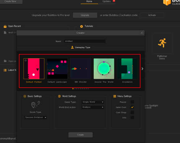 다양한 Template 를 제공한다 이 Template 중 내가 만들고자 하는 형태를 고르면 바로 게임을 만들 수 있도록 플랫폼이 뜬다